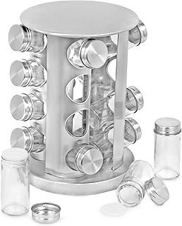 (Round 16 Spice Jars) - Adorox Steel Spice Rack - Round or Square Revolving Stainless - 20 or 16 Glass Spice Jar Bottles - Space Saving Kitchen Storage Organiser for Seasoning Dried Herbs (Round 16 Spice Jars)
