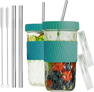 再利用可能なスムージーカップ ボバティーカップ 蓋とストロー付き バブルティーカップ ガラスタンブラー トラベルマグ 広口メイソンジャーカップ (2パック、22オンス) (アクアグリーン)